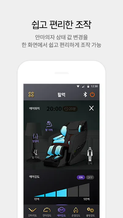 직관적인 UI 마사지 강도, 위치 등 안마의자 상태를 실시간 확인 가능