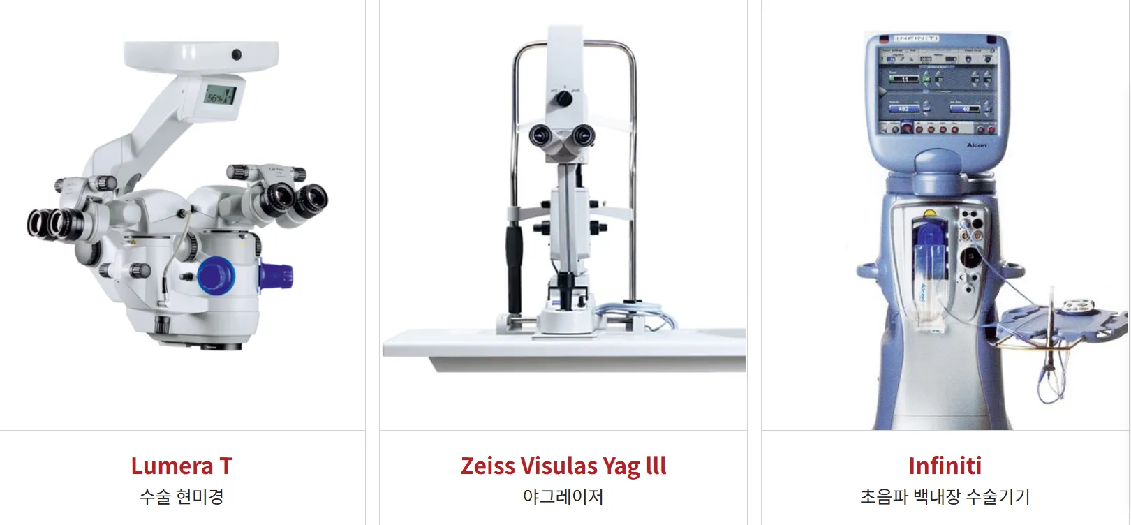 | 수술 장비 | 센츄리온, 칼리스토아이, 야그레이저 등 대학병원급 최신 장비 보유 |